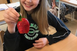 Vi lyckades fånga en megastor jordgubbe på bild innan den försvann ner i gapet på Biss. Övriga elever som satt i klassrummet tittade förund...